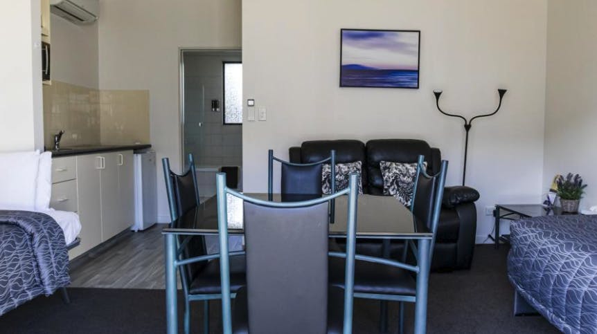 One king bed in separate bedroom and one single bed and one Trundler Bed in Lounge. Max 4 persons. Two hobs for cooking, microwave, toaster. Separate bathroom with spa bath with shower over. A ground floor unit with the extra space. SkyTV with 50+ channels. Free Wifi. Air Conditioning units in rooms.